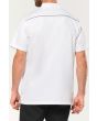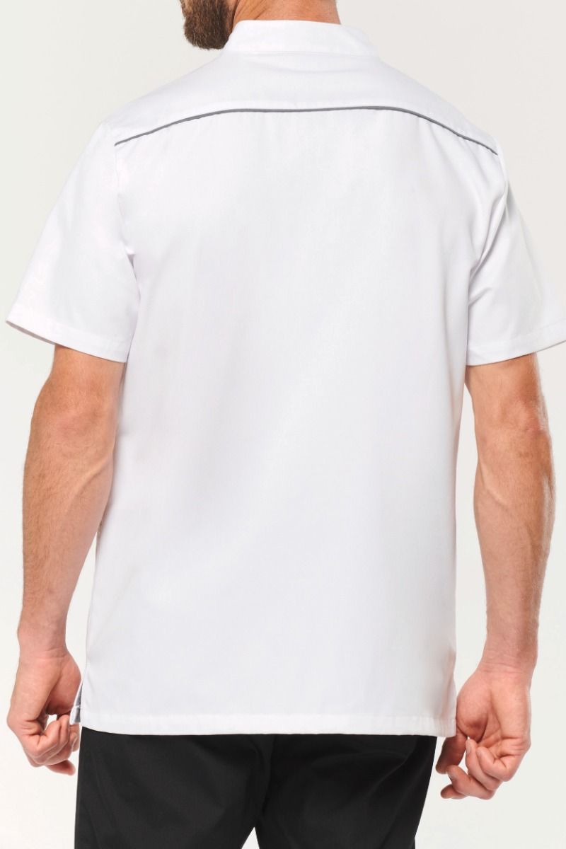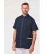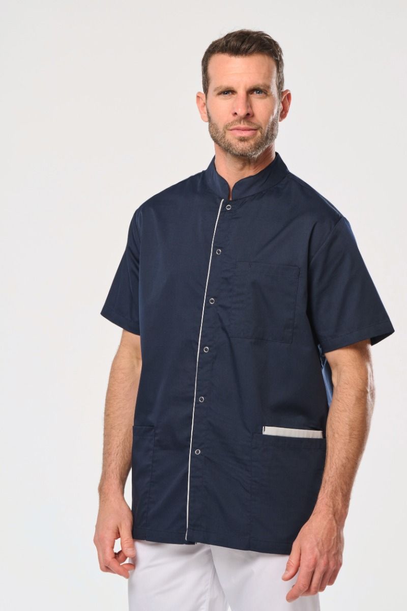 | Omschrijving | 65% polyester / 35% katoen. Twillstof. Norm ISO 15797 Industrieel wassen 75 °C (20 wasbeurten). Fitted pasvorm. Maokraag. Sluit vooraan met drukknopen. 1 opgezette borstzak met pennenvakje links. 2 grote opgezette zakken vooraan, waarvan één (rechts) met twee vakjes (binnenzak met contrasterende boord). Contrasterende bies op de sluiting en op het inzetsel achteraan. Naamlabel aan de binnenkant. Tear-away merklabel. |